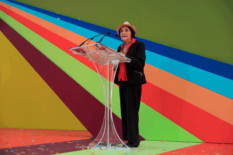 “It’s my great honor to be able to bestow and introduce a person who is receiving the honorary award, and this is a person who came from a working class family—a family that didn’t have a lot of privileges,” said Huerta. “But she used her art to be able to show the world what it is about all of the people that make up a society, including farm workers, laborers, politicians, people that are often discriminated [against].”